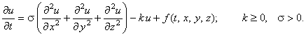Запишем трёхмерное дифференциальное уравнение параболического типа, не содержащее первых производных по координатам x, y и z, в следующем общем виде: