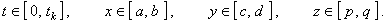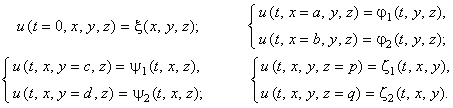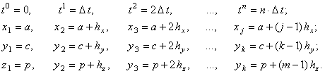 n - порядковый номер точки деления по оси t; j - порядковый номер точки деления по оси x; k - порядковый номер точки деления по оси y; m - порядковый номер точки деления по оси z; - величина интервала между точками по оси t;