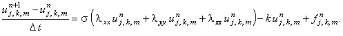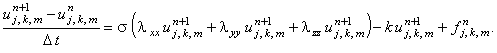 Рассматривая аппроксимацию производных второго порядка на (n + 1)-ом шаге по времени, получаем неявную разностную схему: